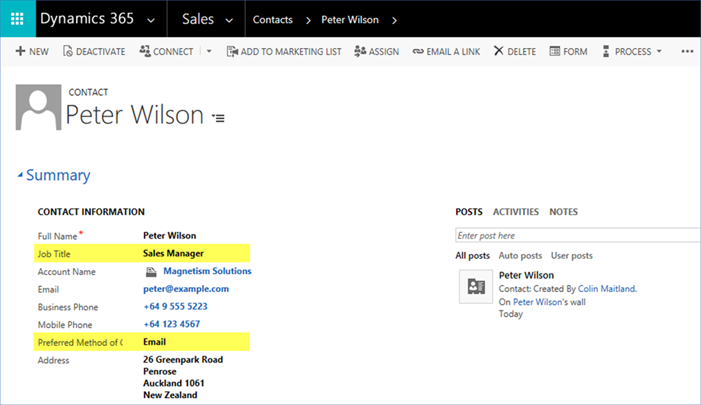 Another User now updates one or more of the designated fields on the Contact, such as the Job Title and Preferred Contact Method: