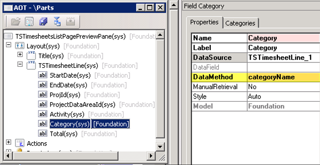 Analyzing the TSTimesheetsListPagePreviewPane info part we can see that values for some fields like "Activity" and "Category" will be returned by respective edit methods from TSTimesheetLine table:
