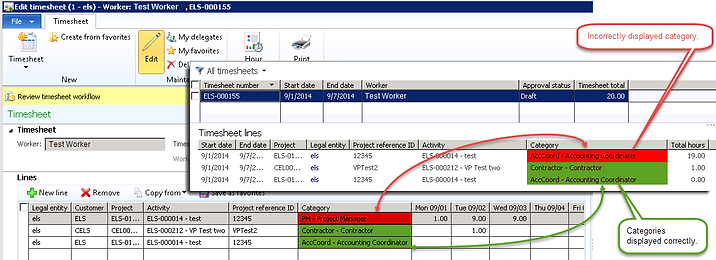 The defect can be described in following manner: the category value displayed in the "Timesheet lines" info-part does not match the real value from the timesheet line.
