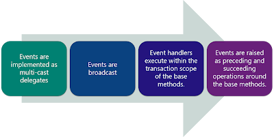 - Events are raised as preceding and succeeding operations around the base methods. This means that you have the opportunity to run code before a base method is called and after it has completed.