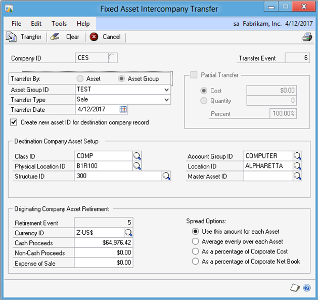 | Fixed Assets IC Transfer window |