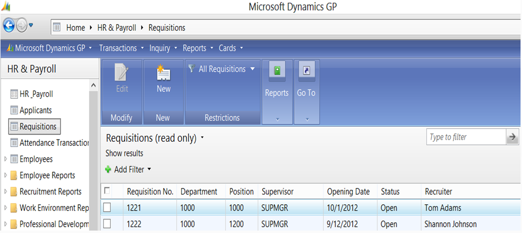 | Requisitions Navigation List in HR & Payroll |