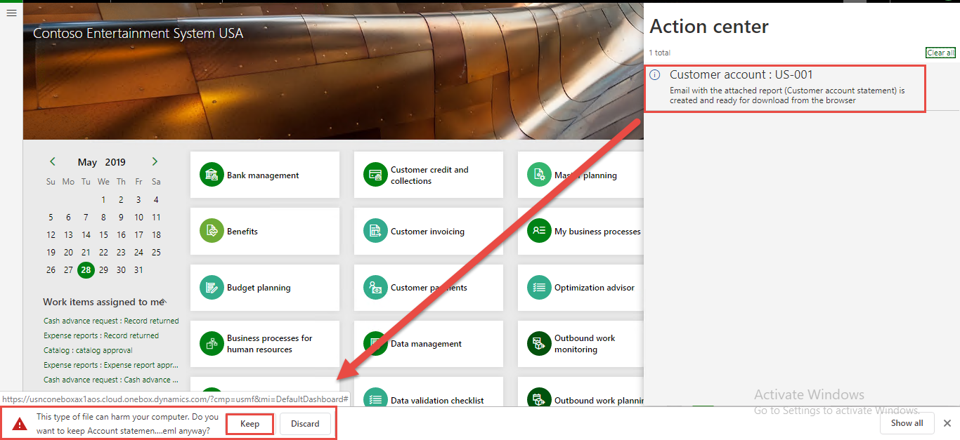 Let’s demonstrate this on the example of emailing the Customer account statement report (Accounts receivable -> Inquiries and reports -> Customers -> Customer account statement).
