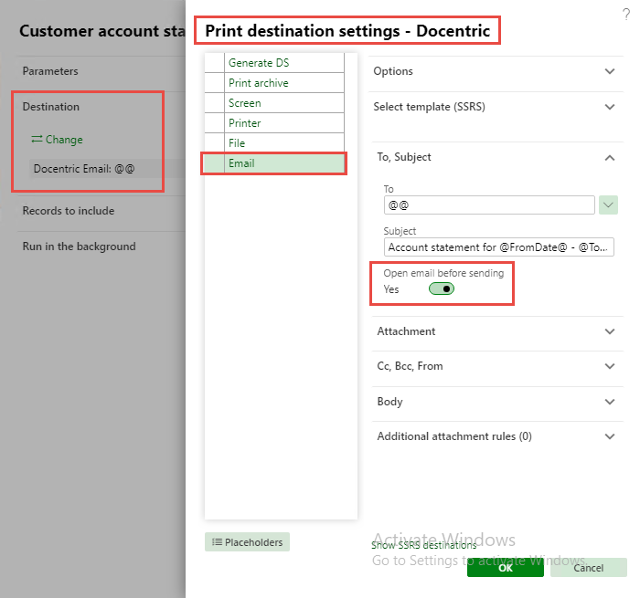 For this example, in the report dialog, I have selected one customer for which I want to print the report and I have changed the target print destination to Docentric Email.