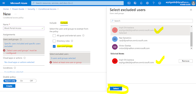 Under Exclude > Select users and groups > choose Users and group checkbox > Search the user or group that you want to keep out of this policy and then Select to add them in the Exclude list.