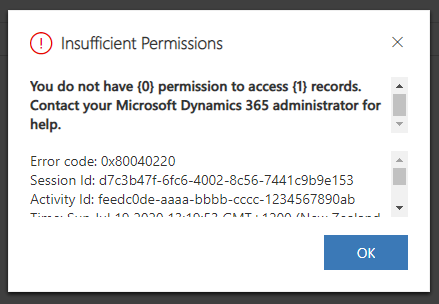 You do not have {0} permission to access {1} records. Contact your Microsoft Dynamics 365 administrator for help.