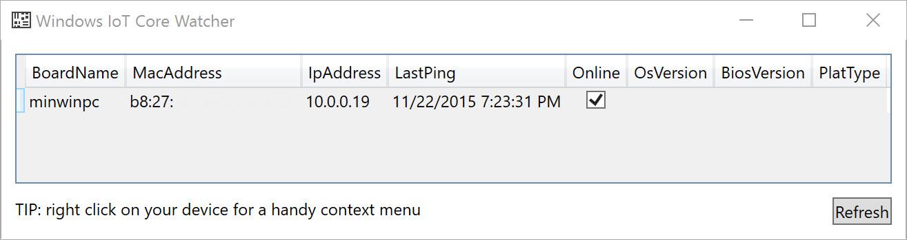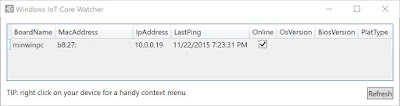 - IoTCoreWatcher – Download from here. This tool displays all the Windows 10 IoT Core devices on your network.