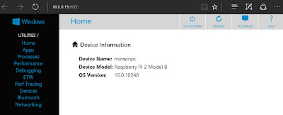 In Windows IoT Core Watcher, right click on your device, then select Web Browser Here. This web-based management tool can be used to control your Windows 10 IoT Core device. You can shutdown, reboot, apps management, see running apps, see installed apps, configure BT, networking etc.- Enter Administrator for the username, and supply your password (p@ssw0rd by default).