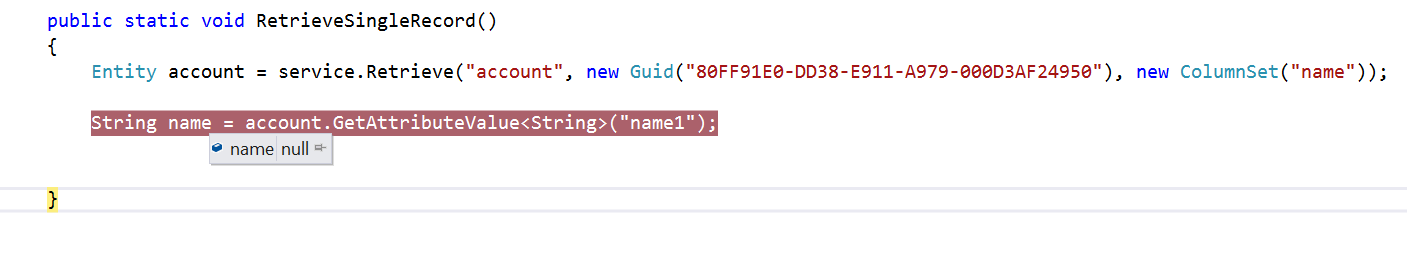 string email = accoundRecord["email"].ToString();This will through "The given key was not present in the dictionary" error, because I have not declared "email" field in column set list.