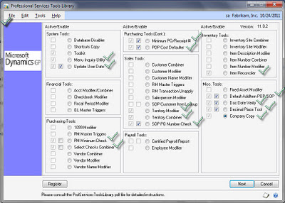 Did you know that PSTL is now a standard part of Dynamics GP 2010? This previously optional set of tools from Microsoft now comes as part of the GP 2010 installation media. While many of the tools still carry a cost, there are 14 tools that come FREE, meaning you don't have to have the PSTL registration keys to activate them. See the checked items below - these are the freebies: