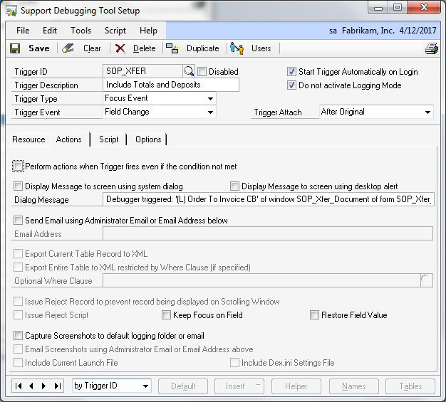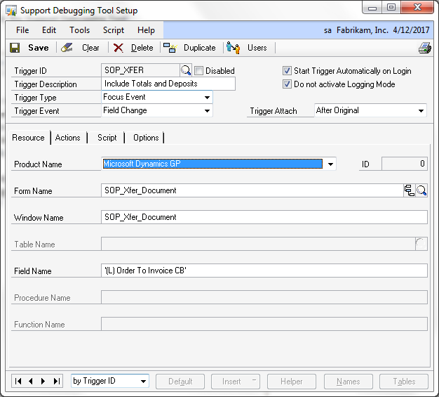 The first thing we need to do is setup the trigger itself. In this case, we want to select a Focus Event trigger that will fire exactly on a field change condition. The field in question is the '(L) Order To Invoice CB' checkbox field. You can use the lookup button next to the Form Name field on the Resource tab to open the Support Debugging Tool's Resource Explorer window and locate the field and select it.