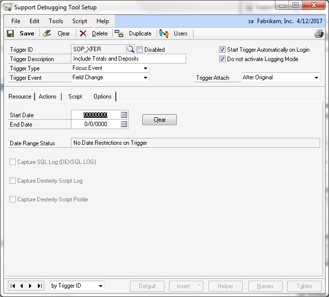 Finally, since this is a non-logging trigger, the Options tab will show all logging options disabled. However, you can still choose a date range for this trigger to take effect.