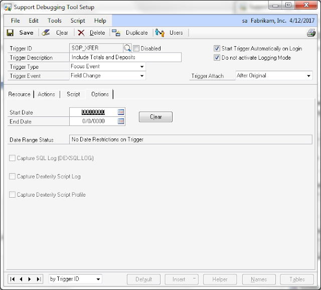 Since this will be a non-logging trigger, we will want to check the Do not activate Logging Mode option on the window. And to make sure the trigger always starts up with Microsoft Dynamics GP, we will want to check the Start Trigger Automatically on Login option as well.
