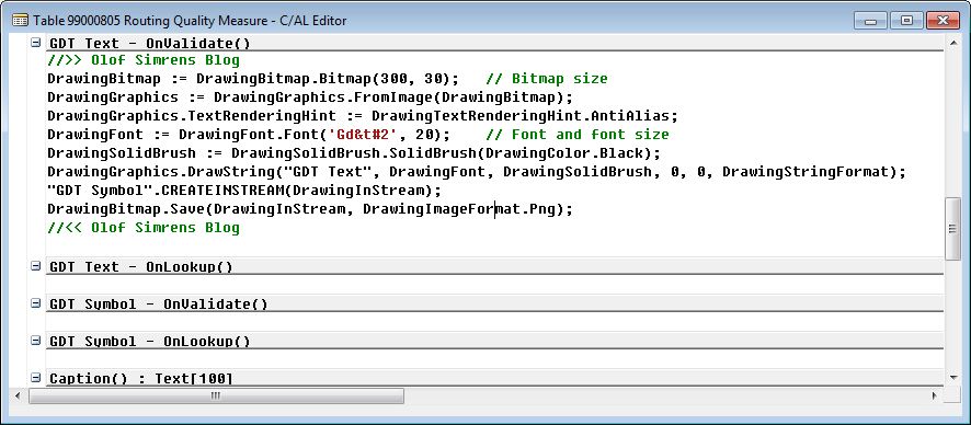 Some weeks ago I came across a requirement to be able to display GD&T symbols in the windows client of NAV 2013 R2 (as part of a quality control system). It sounded easy since the symbols was generated by a string of regular characters displayed with a special font. In the classic client it would just have been to change the font of the text box and it would probably have worked, but it is not that easy in the 2013 version of Dynamics NAV (and I believe the same applies to the NAV 2009 RTC client).