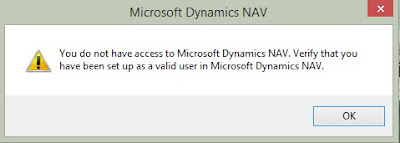 You do not have access to Microsoft Dynamics NAV. Verify that you have been set up as a valid user in Microsoft Dynamics NAV.
