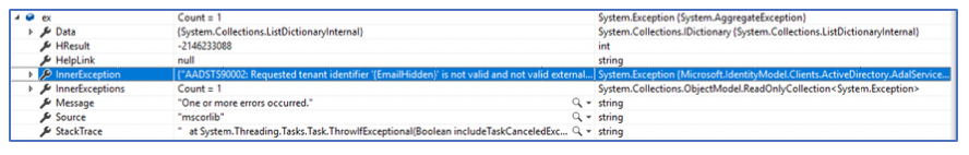 Error: AADSTS90002: Requested tenant identifier '{EmailHidden}' is not valid and not valid external domain format.