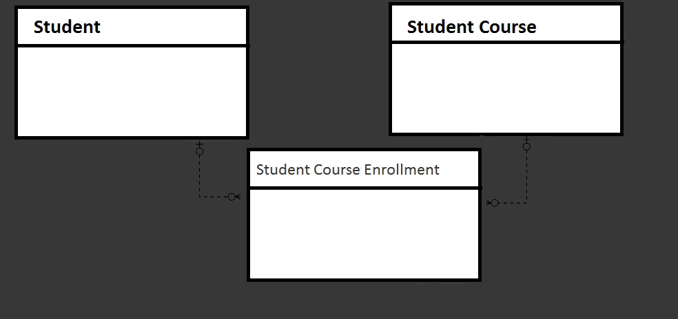 Today I am going to explain the relations between tables by implementing a real time simple scenario. Assume we have a student who is enrolled in a course. We want to keep the track record of the students who are enrolled in one or many courses. We would require two tables one for Student and other one for Course. Multiple students can be enrolled for the one course and one course can be taught to multiple student thus relationship exists between Student and Course is "many-to-many". Therefore, we are going to add one more table naming it "StudentCourseEnrollment". Given bellow would be the ERD.