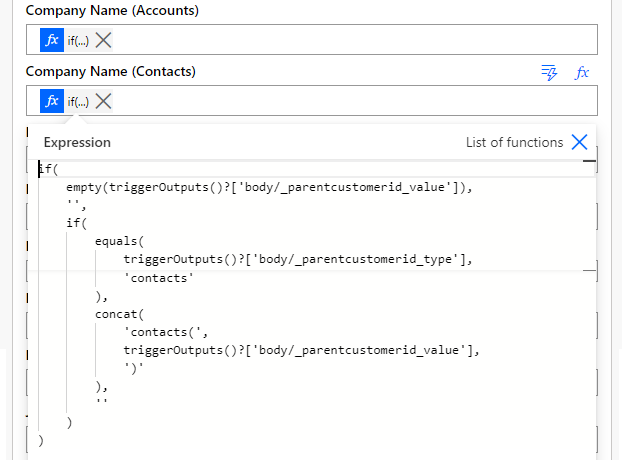In the example above, the duplicate Contact is created from the Contact from the trigger step. The Company Name is the Customer Lookup field which can either be populated with Account or Contact. The following expressions can be used to populate the Company Name lookup based on the entity type of the Company Name value.
