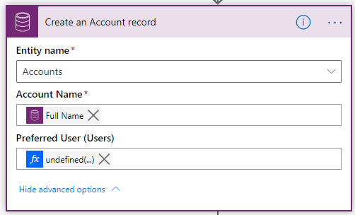 For simplicity’s sake, let’s consider a scenario where the system must create a new Account record if a Contact record is created and if the Company Name field of the Contact is empty. One of the requirements is to populate the Contact’s Full Name into the Name of the Account and the Preferred User of the Contact into the Preferred User of the new Account. In this scenario, the Preferred User field of the Contact entity is optional and the value can be empty for some of the Contact records.