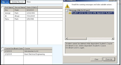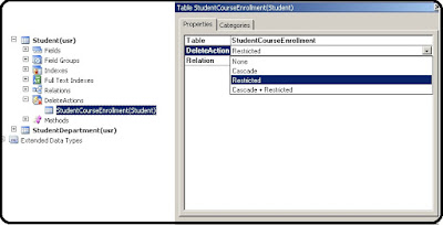 Each of the record in table StudentCourseEnrollment will be child of both Student and Course. Obviously, when a student in enrolled in a course, his record will be present in the StudentCourseEnrollment table. In other words StudentCourseEnrollment table is related to table Student.What if someone deletes the Student whose referrence is in StudentCourseEnrollment table? That's where delete action plays their part in Dynamics AX.