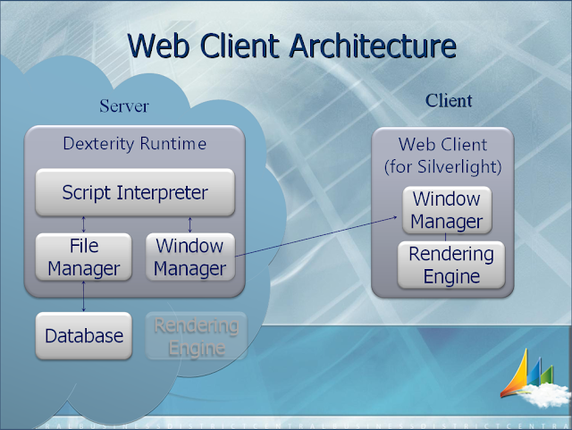 With the Window Manager and Rendering Engine decoupled, you can now conclude that a Microsoft Dexterity application can run as a service in the background, awaiting for events that would be either received via a traditional Win32 form or a Silverlight client, and STILL be able to execute script events regardless of the type of form they were submitted through. The theory also would indicate that a Microsoft Dexterity application is the basis for a Web Client version of itself. This is, a Microsoft Dexterity applications can leverage the new architecture elements to become web enabled - but not the other way around (yet!).