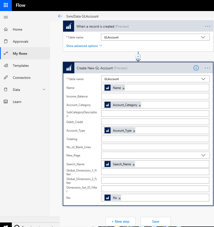 b) If you try to create a new Flow from blank, there is no option to select NAV Action or Trigger. To work around it, you should select to import one. Please contact me, if needed one example to import. After importing, the NAV action and triggers become available.