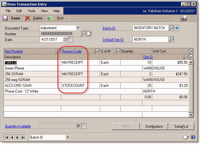 Inventory transaction "Reason Code" field in GP 2013