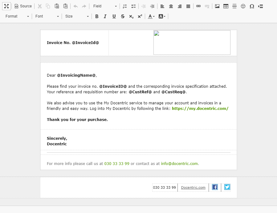 The first thing that made me very happy is a possibility to create an HTML email body with dynamic parts. Depending on a report you will be able to use some contextual information in the email body, for example Invoice ID or Customer account number. Besides plain text placeholders, there are also image placeholders you can use such as Company logo or Worker image. You can pick among them in the Fields drop-down list in the email body editor.