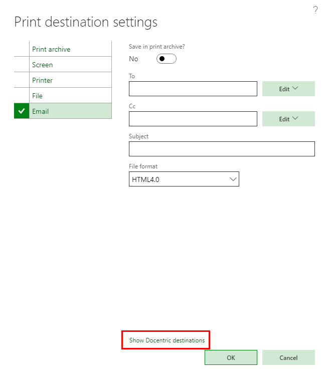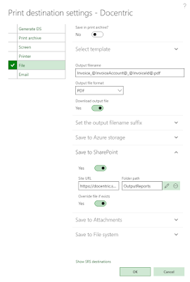 When you install it, start any report and open the Print destination settings form. You will notice a new link Show Docentric destinations as shown on the image below. When you click it, Docentric print destinations will open, bringing many new possibilities to the table.