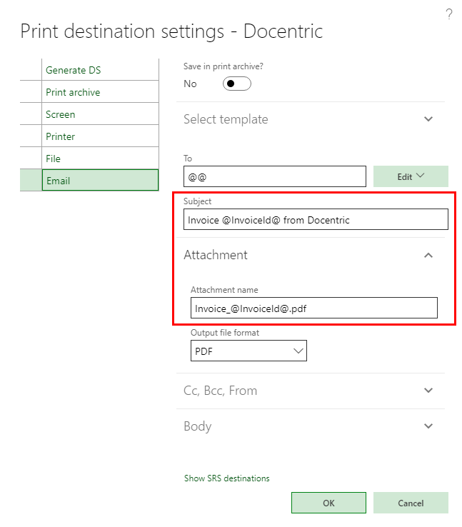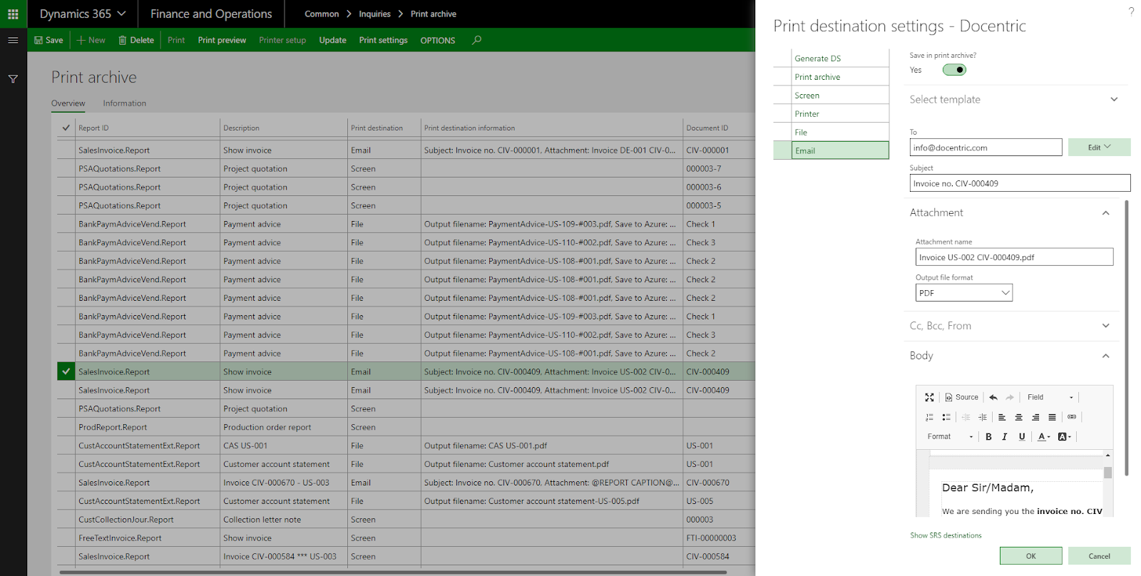 Built-in Print archive contains archived reports that you can search by the Description field only (this data actually comes from report caption, e.g. ‘Show invoice’). Wouldn’t be great if we could search archived reports also by customer/vendor, Invoice ID, Sales/Purch ID, etc.? Even more, I would certainly like to see the email body of emailed reports including all the recipients (i.e. expanded email tokens), subject, etc. I was pleasantly surprised when I discovered that Docentric enables all of that.