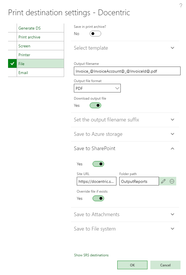 Besides sending files to browser for download, you can save files (also in batch) to Azure blob storage, SharePoint, Attachments or File system (applicable for on-premises). You can use placeholders in any of these settings, e.g. in Azure blob container or File system folder path.