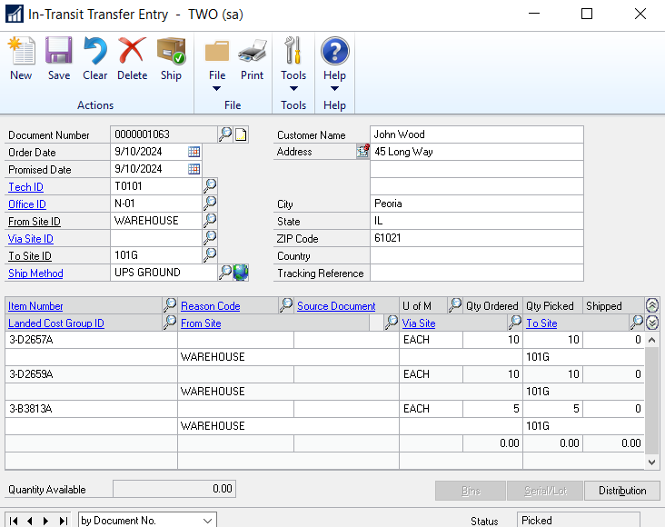 Once the items are filled out on the in-transit window, they need to be shipped, upon which an inventory transfer document will be posted automatically transferring the items from the (From Site) to the (Via Site)