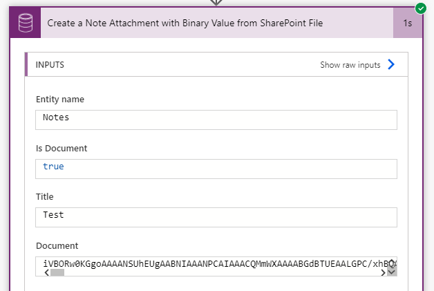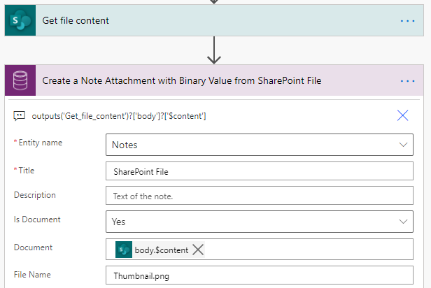 Get file content action will return the SharePoint file content in Binary but creating a Note attachment requires Base64 value. Using the ['$content'] property of the output with the following expression will populate with Base64 value to the Document column.outputs('Get_file_content')?['body']?['$content']