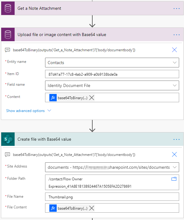 Understanding what type of file content to use in certain parameter is important. Sometimes, conversion of one type to another is required when the type of the output is different from the required input for the next step (e.g. get the Note attachment file and upload to SharePoint).