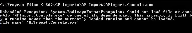 After completing this upgrade process for my integration (a scheduled Console application), I copied my upgraded EXE and DLL files to the client's workstation. We then tested the integration. As soon as we tried to run the EXE using Task Scheduler, the import crashed and we got an error message.