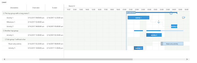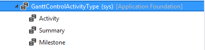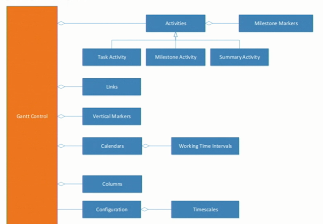 Activity : This is most important element is a Gantt control. Each activity is allocated its own row in the chart. Activities can form a hierarchy, like a tree, by referencing a parent activity. Two activities can be connected to each other through links. A Gantt activity can be further classified into a Milestone activity, task activity or a summary activity. Technical base is provided a base enum which holds the type of Gantt control activity