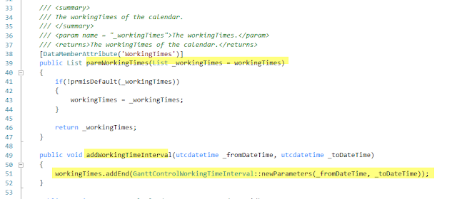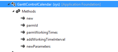 Calendar and working time intervals : Calendar holds the calendar ID and the working time intervals holds a set of working time information. These are controlled by GanttControlCalendar and GanttControlWorkingTimeInterval classes. This information is stored in below contract classes: