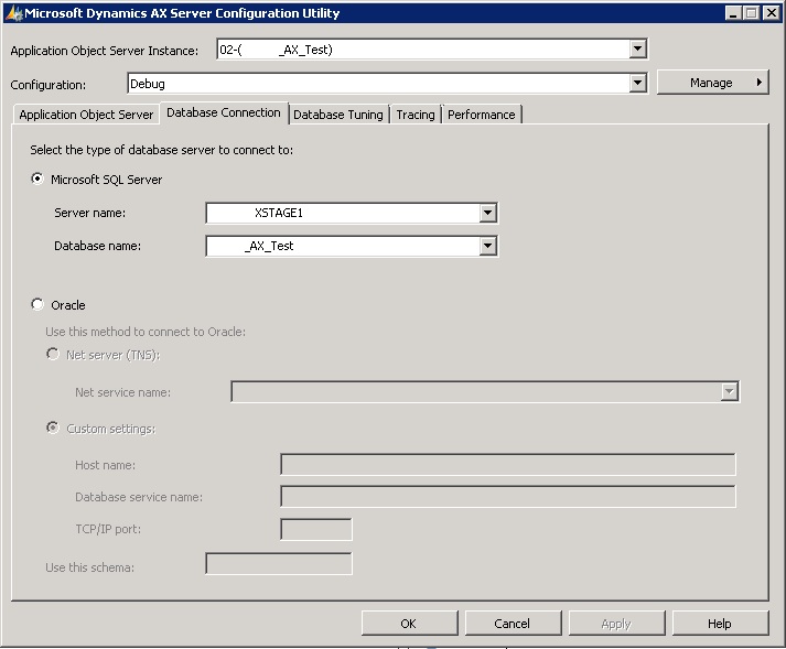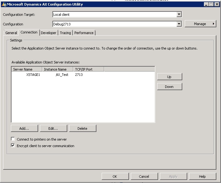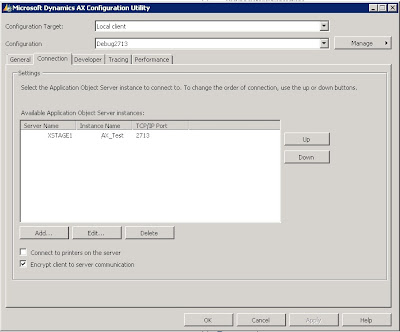 3- Set the server name, instance name and port (the default for the first instance of AX will be 2712. If you have more than one instance make sure you have the right port. In my case the AX second instance is 2713)
