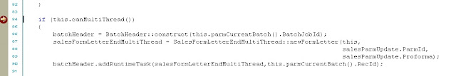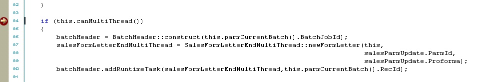 The following are the steps to accomplish debugging X++ code in a batch server. The example is going to be using the SalesFormLetter class run method.