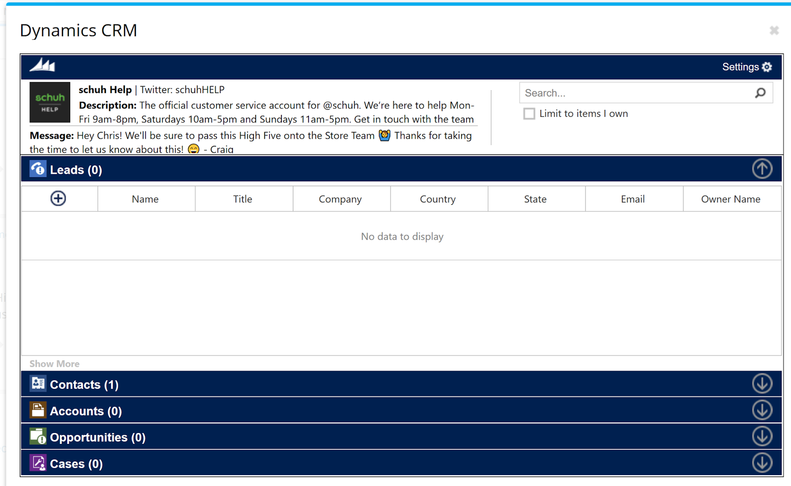 Essentially, this integration into Dynamics 365 from Hootsuite is a basic Dynamics 365 user interface within the Hootsuite UI, that exposes basic Dynamics 365 functionality and data to Hootsuite users. Users will require a Dynamics 365 Customer Engagement user license to access the information and functionality in order to track leads from Hootsuite to Dynamics 365.