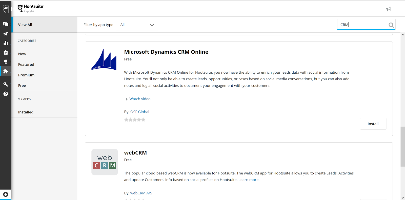 Navigate to the "App Directory" on the left hand side of the page and select the "Free" apps option. In the top right hand search box enter in "CRM". This will filter the list to the CRM apps where you will need to scroll until you see Dynamics. Click the "Install" Button.