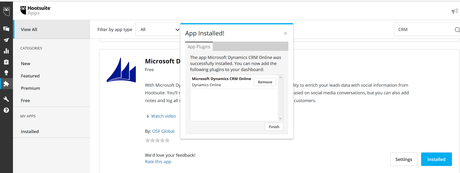 The App installs and once it is complete you will be notified through a small notification. This means the plugin can now be accessed from the main screen in Hootsuite.