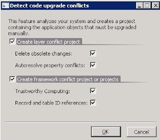 - In Ax, run Microsoft Dynamics Ax--Tools--Development tools--Code upgrade--Detect code upgrade conflicts.