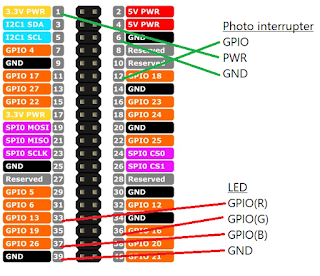 Photo interrupter GPIO <-> GPIO18 PWR <-> + GND <-> - LED GPIO(R) <-> GPIO13 GPIO(G) <-> GPIO26 GPIO(B) <-> GPIO16 GND <-> - |