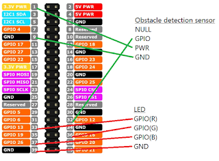 Obstacle detection sensor NULL (Not connected) GPIO <-> GPIO12 PWR <-> + GND <-> - LED GPIO(R) <-> GPIO13 GPIO(G) <-> GPIO26 GPIO(B) <-> GPIO16 GND <-> - |