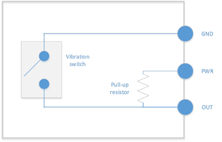 Inside vibration sensor there's a switch that can break an electrical circuit, interrupting the current or diverting it from one conductor to another. In addition to switch it is required to have a pull-up resistor. In electronic logic circuits, a pull-up resistor is a resistor connected between a signal conductor and a positive power supply voltage to ensure that the signal will be a valid logic level if external devices are disconnected or high-impedance is introduced.