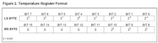 The DS18B20 output temperature data is calibrated in degrees Celsius, for Fahrenheit applications a conversion formula must be used. The temperature data is stored as a 16-bit sign-extended two's complement number in the temperature register (see Figure below). The sign bits (S) indicate if the temperature is positive or negative: for positive numbers S = 0 and for negative numbers S = 1. If the DS18B20 is configured for 12-bit resolution, all bits in the temperature register will contain valid data. Table below gives examples of digital output data and the corresponding temperature reading for 12-bit resolution conversions.