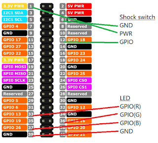 Shock switch GND <-> - PWR <-> + GPIO <-> GPIO18 LED GPIO(R) <-> GPIO13 GPIO(G) <-> GPIO26 GPIO(B) <-> GPIO16 GND <-> - |