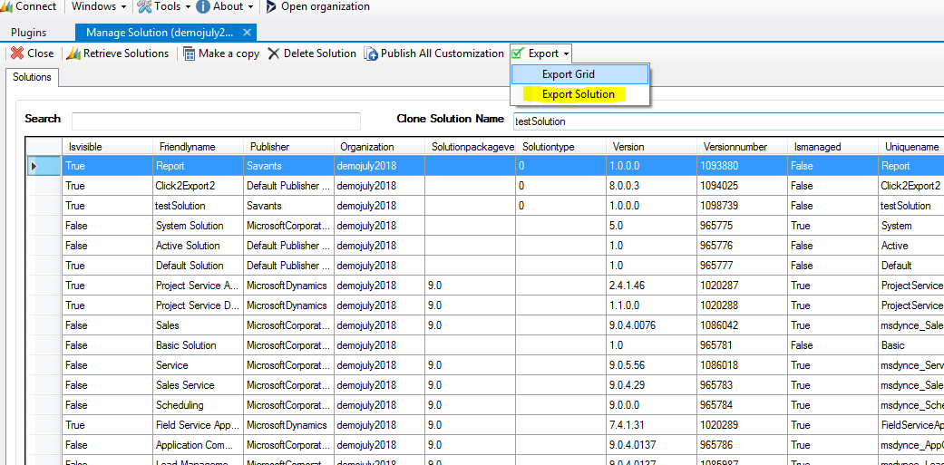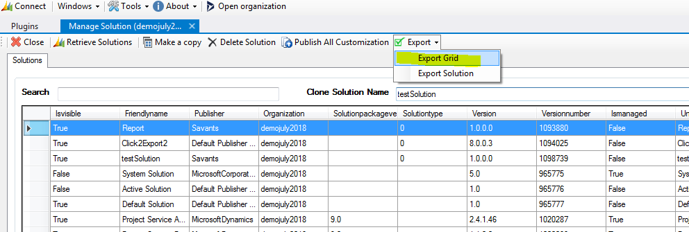 To export all solutions list, click on “Export Grid” button provide your location to store solution excel sheet. Make sure you have MS office preinstall to use this option.