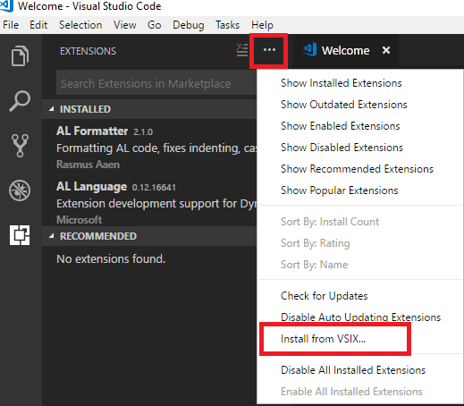 2.2 Click on the more button ( three dots) and select Install from VSIX. Navigate to the path “CU 02 NAV 2018 NA\NAV.11.0.20348.NA.DVD\ModernDev\program files\Microsoft Dynamics NAV\110\Modern Development Environment” to install VSIX